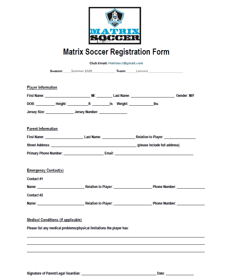 PARENT & PLAYER RESOURCES Matrix Waiver & Policy Form View PDF Matrix Code Of Conduct Policy View PDF Matrix Registration Form VIEW PDF Política y Formulario de Exención de Matrix VER PDF Código de Conducta del Jugador de Matrix VER PDF Women’s League Policy & Agreement View PDF Matrix Roster Log VIEW PDF Matrix Coach & Volunteer Agreement View PDF Women’s League Roster Form Learn more