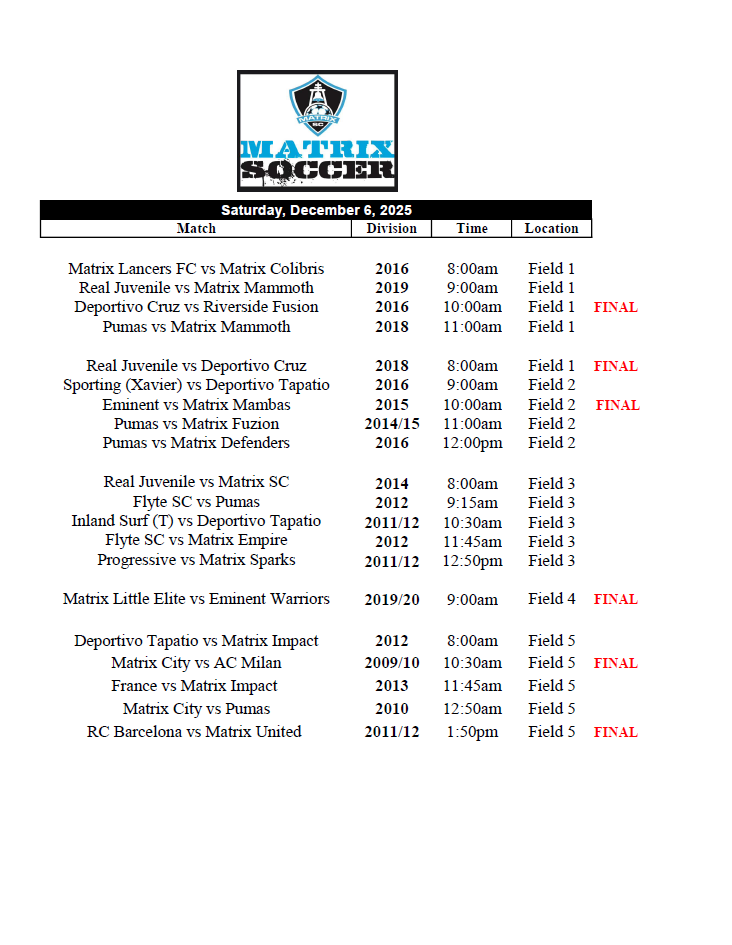 CLASH OF CLEATS League Game Schedule Season: Fall 2025 Download PDF LEAGUE STANDINGS Season: Fall 2025 Download PDF FUTSAL LINEUP Futsal League Game Schedule Download PDF FUTSAL STANDINGS Season: Fall 2025 Download PDF